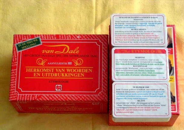 A Het Groot Van Dale Spel der Nederlandse Taal: Etymologie egy nagyon könnyen tanulható kiegészítő a Het Groot Van Dale Spel der Nederlandse Taal társasjátékhoz, 2 - 6 játékos részére, az átlagos játékidő rövid, csak 30 perc. A társast, a könnyebb tanulhatósága ellenére, csak 15 éves kortól ajánljuk kipróbálni. A játékmenet erősen épít a forgass és mozgass...