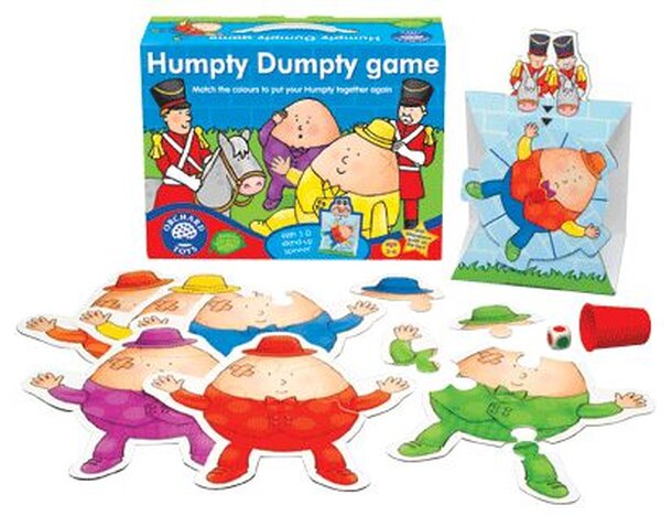Oh dear, Humpty Dumpty's had a great fall! Can you help the king's men? Spin the big 3-D spinner and try to collect the matching colored pieces to put Humpty together again. A fun game for 6 players, based on the enduringly popular nursery rhyme.
