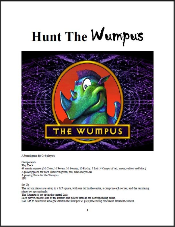 A Hunt the Wumpus egy kiváló társasjáték, 2 - 4 játékos részére. A játékmenet erősen épít a moduláris tábla és a kártya húzás mechanizmusokra.
