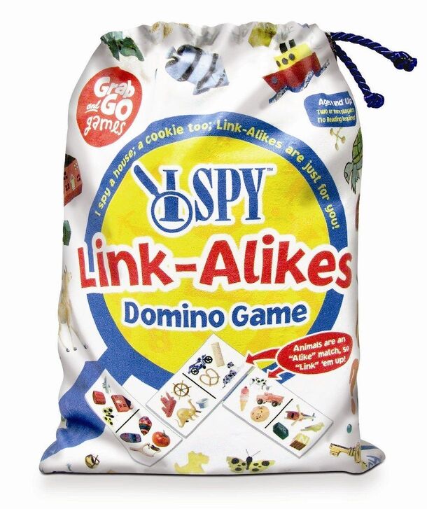 Match "alike" I Spy objects and numbers. Great for fun on the run...Games to Go! Contents: 24 double-sided Link-Alike dominos Objective: Use up all your dominos by linking them...