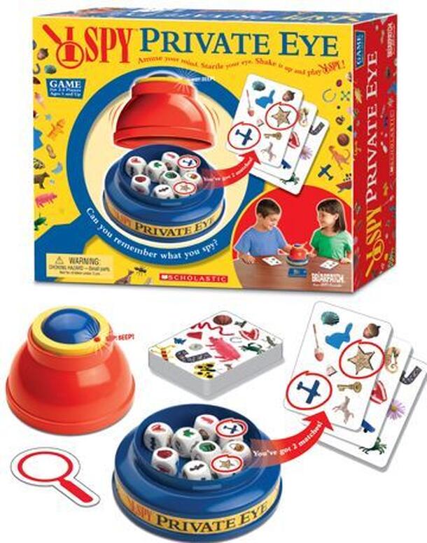 Become an I Spy Private Eye.....can you remember what you spy? Shake up the cubes,press the timer and go! You have 30 seconds to spy the I Spy images on all 9-picture cubes before they are hidden from view. "Beep,Beep!"...times up! Examine the evidence. Choose one I Spy picture card and find all the images that match the cubes and score points....but watch out for a challenge!