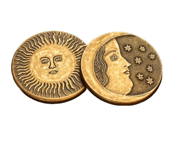 The Illimat Syzygy Coin: A bronze challenge coin that when used as an okus has official gameplay properties. The coin uses the Luminary Sun & Initiate Moon illustrations by Carson Ellis from the game Illimat.
