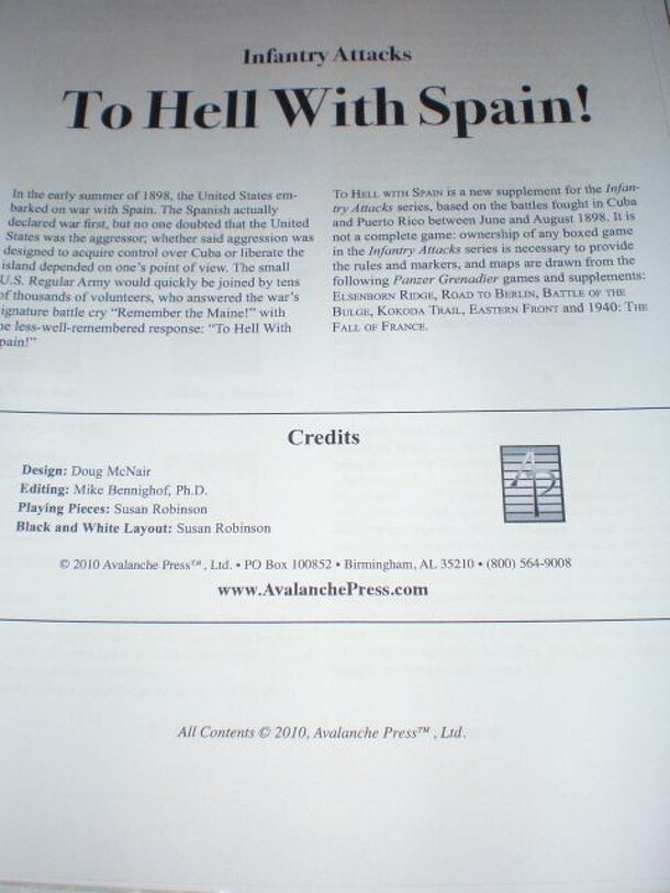 Az Infantry Attacks: To Hell With Spain egy közepesen összetett kiegészítő az Infantry Attacks: August 1914 társasjátékhoz, 2 játékos részére, az átlagos játékidő rövid, csak 30 perc. A társast, a bonyolultsága miatt, csak 12 éves kortól ajánljuk kipróbálni. A játékmenet erősen épít a hatszög-rács mechanizmusra.