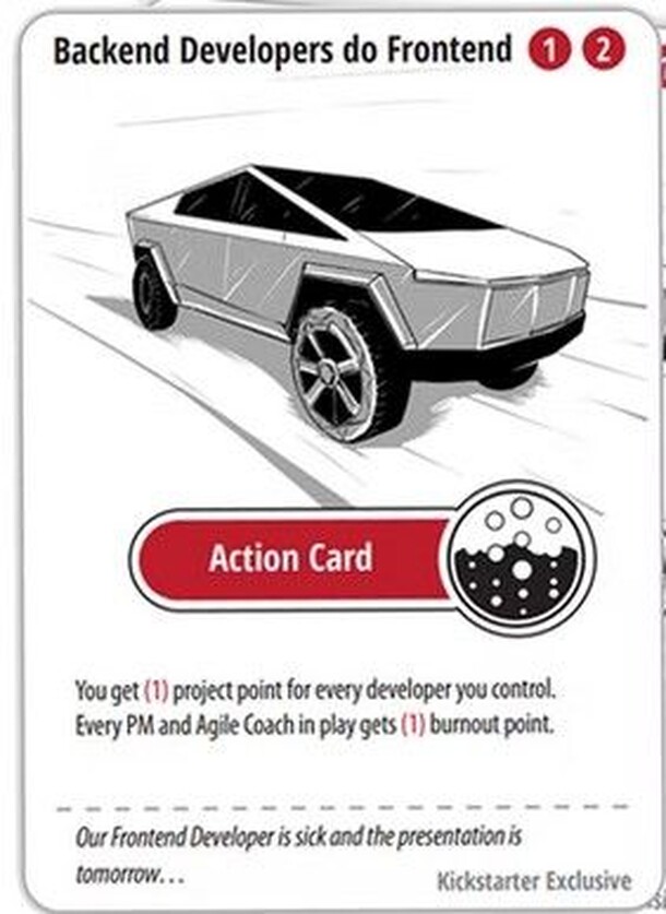 Kickstarter Exclusive "Backend Developers do Frontend" card for IT Startup. This action card can be added to the base game. Card text: "You get (1) project point for every...