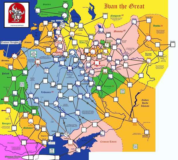 OBJECT OF THE GAME: In brief, Muscovy is trying to gain control of or subdue as many countries as possible before the big war with Lithuania, while maintaining high levels on the Ivan's Prestige, Russian Orthodox Church, and Victory Point charts. Some of these countries will become full allies, others will just be reduced so as not to cause serious trouble in Ivan’s rear later on. Once the war with Lithuania begins, Muscovy will try to take over as much territory from Lithuania as he can. (Military success may possibly make up for any shortfalls in the three charts.) The Lithuanian player is simply trying to throw as many monkey wrenches as he can into Muscovy’s plans by keeping up pressure on various fronts, military and geographical (the map) as well as political (the charts).