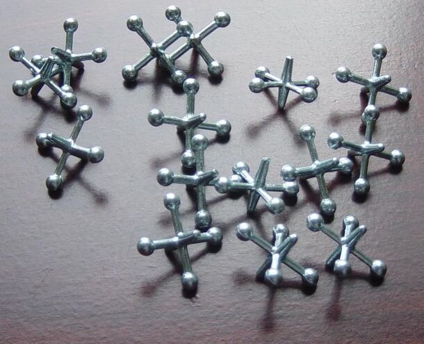 Played with 10 "jacks" and a small rubber ball. Players take turns. On a player's turn, he must first throw the jacks onto the floor. If any of the jacks land so that they are...