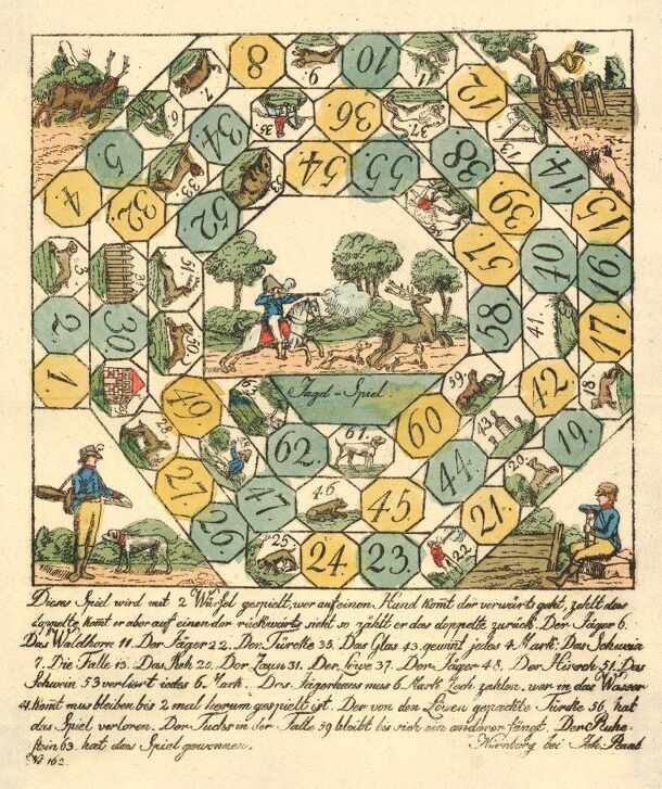 A roll-and-move game published in Nuremberg. The gameboard depicts animals.