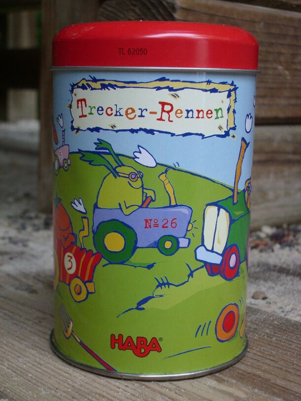 Two tractors are racing each other (preferably on carpet or any other surface that isn't too smooth). They are put on a starting line and a finish line is defined. A color die is rolled. The wheels of the tractors have color dots, and the color rolled determines how far to move the tractor (until that color points upwards). The first player to cross the finish line is the winner.