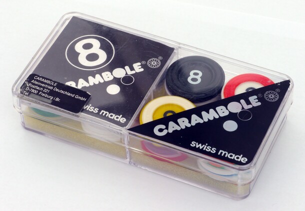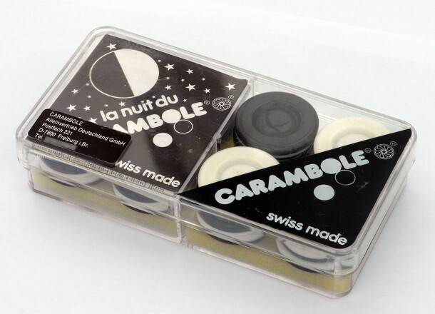 Carambole is a variant of Carrom ("finger pool"). It was designed by Swiss engineer Mändu Stauffer. The game then spread in Western Europe in the 80's. The wooden board is 60 cm x 60 cm with four 4.5 cm diameter holes in the corner. The aim is to sink 9 checkers (black or white) and the lone red checker. One wins as many points as the number of checkers...