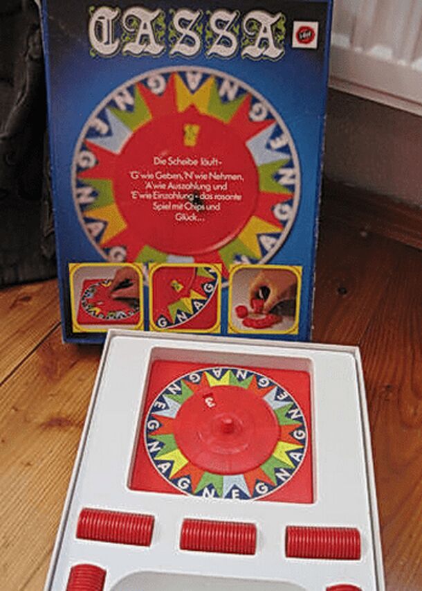 This is a game for ages 6 and up. The box contains 1 potter's wheel and 100 coins. The wheel contains 2 circles, and is therefore always showing two results. The outermost circle contains 4 letters (G, N, A and E), the inner circle contains the numbers 1 to 6. The coins are distributed amongst the players. On your turn, you name one of the other players...
