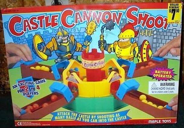 Castle Cannon Shoot is a two- to four-player shooting-gallery game in which the object is to fire all your fire “cannon balls” into the courtyard of the rotating castle. Each player selects eight marble-like “cannon balls” of one color and places them in their own shooting alley. The castle is set spinning, and all players simultaneously attempt to shoot...