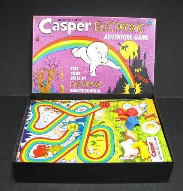 "WHEN CASPER LIGHTS UP, YOU WIN A CHIP" From the box: A game of chance based on the popular, lovable Casper character. Players compete to win chips by making Casper light up. All parts glow in the dark. Requires one AA-type battery. Each player is given a 'spooky stone' (a piece of molded plastic with four symmetrically positioned holes); Casper and the...