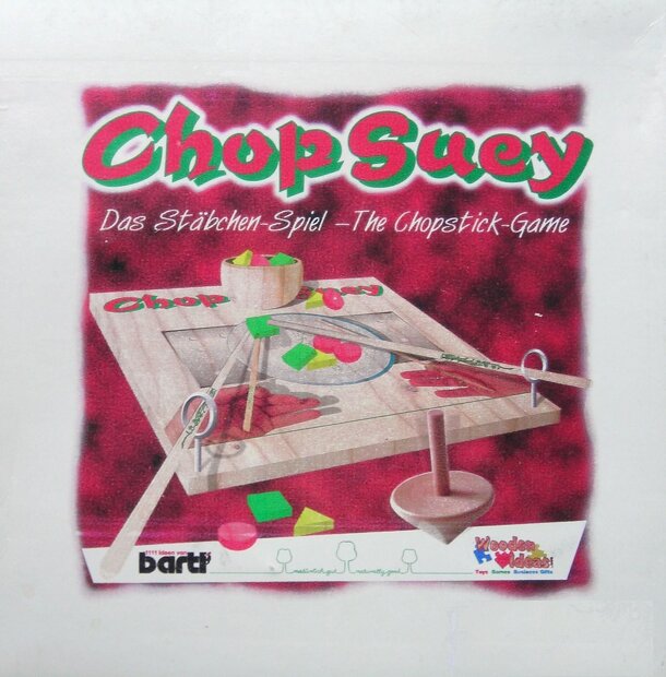 Chop Suey. Ideal 1967. There is a wind-up rotating bowl in the center which is filled with plastic food pieces. These are worth different point values. Play consists of all players simultaneously attempting to pick these pieces out of the rotating bowl with their chopsticks. Play continues until the bowl stops rotating. Further rounds include the addition...
