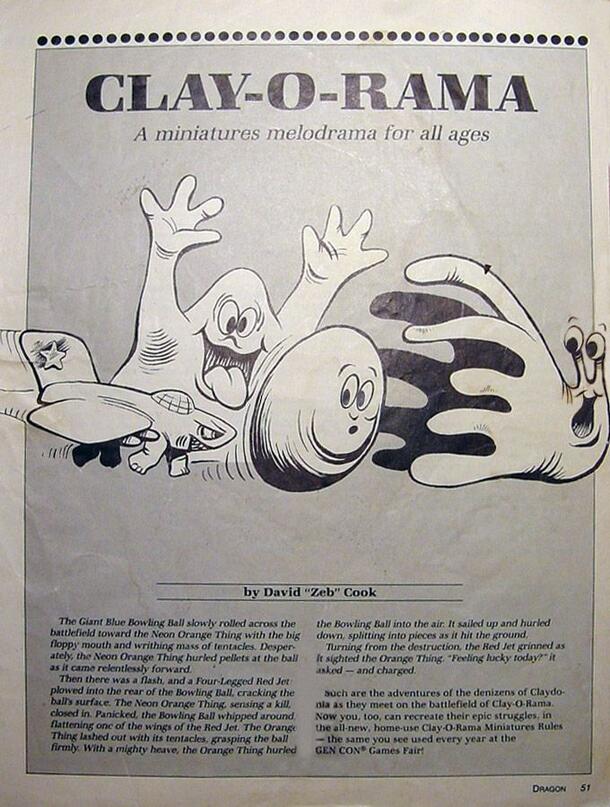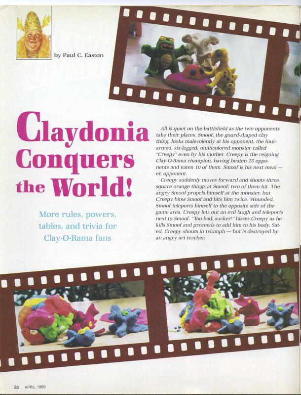 Claydonia Conquers the World! is an expansion rule set for Clay-O-Rama. Claydonia Conquers the World! was published in Dragon Magazine #144 pp. 28-31 April 1989. The original Clay-O-Rama game was also published in Dragon Magazine (issue 125) by David "Zeb" Cook. The original Clay-O-Rama had players make monsters (Claydonians) out of Play-Doh in order to...