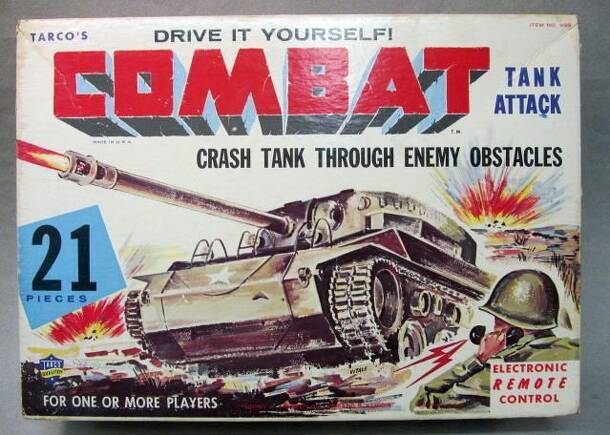 This is a three-dimensional dexterity game with a military theme published in the late 1950s or early 1960s. Terrain is represented with a cardboard base and plastic landscape features. A colorful background depicts a WWII battle scene. A plastic tank is guided along a road network using a magnetic control device. The tank commander scores points for...