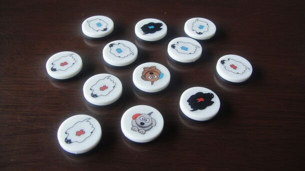 The game consists of a board and two dice; one with numbers 1 - 6 and one with cartoons (car - boat - train - cat - bird - pig). The board has 36 squares with holes in the middle. Every square is a combination of the dice (train + 1, pig + 4, etc.). Throw the dice and see what combination comes up. Players try to find the combination on the board and...