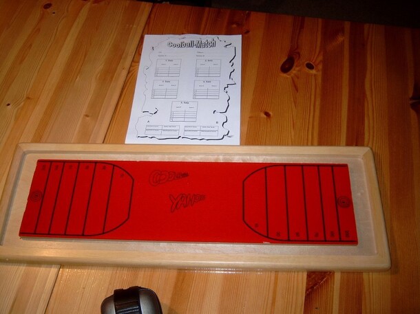 You try to roll small balls on the other side of the board and score points. You score points depending on the area the ball lands. In one area you get bonus balls. The game lasts over 3 winning sets, with 3 tries per player each set. This game is the re-incarnation of Magoo, that was presented at Essen in 1995 in 3 editions: a deluxe edition made of beech...