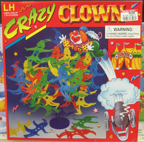 A simple dexterity game for children, in which the object is to add clowns to a shared "clown tower"; if a player, on their turn, causes a clown to fall off or causes the tower to fall over, they're out of the game. Players can either be responsible for one (or more) colors and add clowns one at a time, or roll a die and add that many clowns of any color...