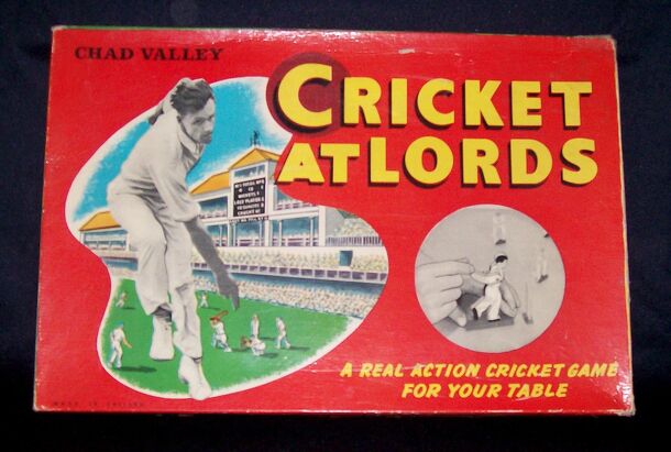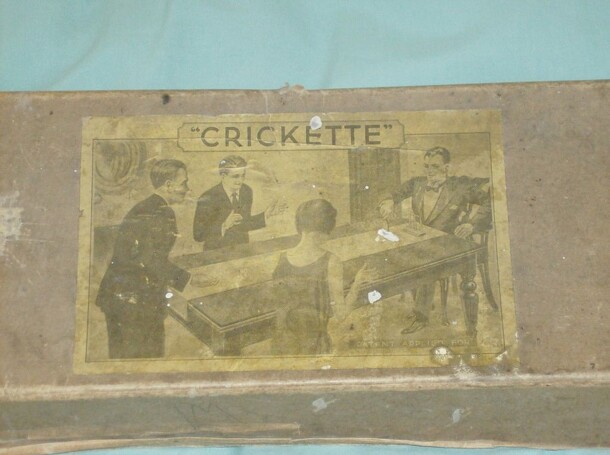 Action game. The board consists of a length of baize, which is around 6 feet long. One player rolls a ball at the stumps (nice stumps and bails included)whilst the other player tries to hit the ball with his bat. The rules do not say how many runs are scored after the ball has been hit, you can decide for yourself. The box suggests a date of around 1925...