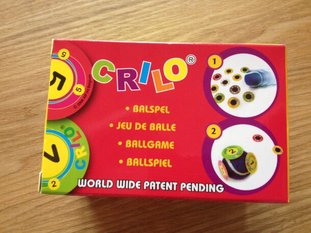 Crilo is a dexterity based game for one or more players. it is played by rolling a Crilo ball over Crilo cards to gain points. The Crilo ball resembles a tennis ball, but is covered with a velcro loop texture. The Crilo cards are 15 discs with a velcro patch in the centre, each worth a different amount of points. The goal is to get as many points as...