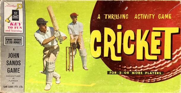 Unusual offering from John Sands. Comes with a small Masonite cricket bat, table tennis balls, a rectangular plastic grid and a series of flat cardboard cricket balls, each sporting a particular outcome (3, 6, run out etc.). The cricket balls are placed in a plastic grid of squares, one in each compartment, by the 'bowler' who then tosses the table tennis...
