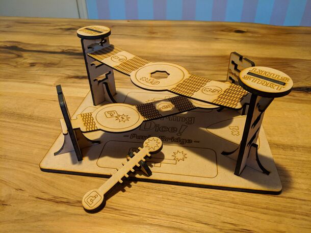 Curling Dice!: UFO is a dexterity game where players flick dice onto a hanging, multi-level spaceship-shaped board. Players initially take turns using an adjustable see-saw catapult to toss dice onto the hanging platforms. There is then a round of flicking dice on the platforms. Points are scored based on the location of dice on the platforms as well as...
