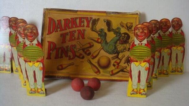 A throwing game from an age of racist Americana. The game features ten 6-1/2 inch heavy cardboard lithographed figures on wood bases. The figures are made to look like stereotypical african-american humans caricatures of the period. In the game, players roll balls at the figures, and whoever hits the most wins. Sold as an novelty game, it was first...