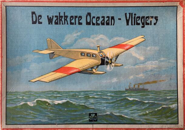 De wakkere Oceaan-Vliegers ("The Brave Ocean Flyers") is a Dutch-language aviation-themed target game by a German publisher (Klee). It is undated, but c. 1930 judging by title's declaration of ocean-crossing as dangerous and by the artwork featuring a combination of biplanes, single-engine monoplane seaplanes and a trimotor. The game board is a map...