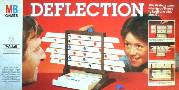 Deflection - an abstract game in which players drop colored counters into a rack made of sliding strips. The counters drop through slits in the rack and the players take turns to move the strips back and forth, trying to get their tokens to fall into the highest scoring sections of the bottom tray, while at the same time blocking their opponent or forcing...