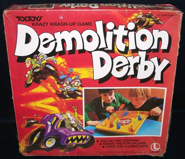 From the box: "You do the steering - smash the pop-up cars - race the closing gate" The plastic gameboard, which is about 13" square, has a series of two-dimensional colored plastic target cars set on it which are triggered by rubber bands located beneath the board. A small area of the board is sectioned off (the Pits) behind a gate which serves as the...