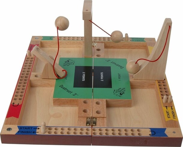 Players take turns launching a metal ball with a sprint loaded rod up a ramp and into one of the holes beyond. Each hole is labeled with point values ranging from 10 to 50. After 10 shots by each player, the highest score win. A perfect game is 500 points. Players can play on teams or cooperatively to try to beat the high score. The skill of the game is...