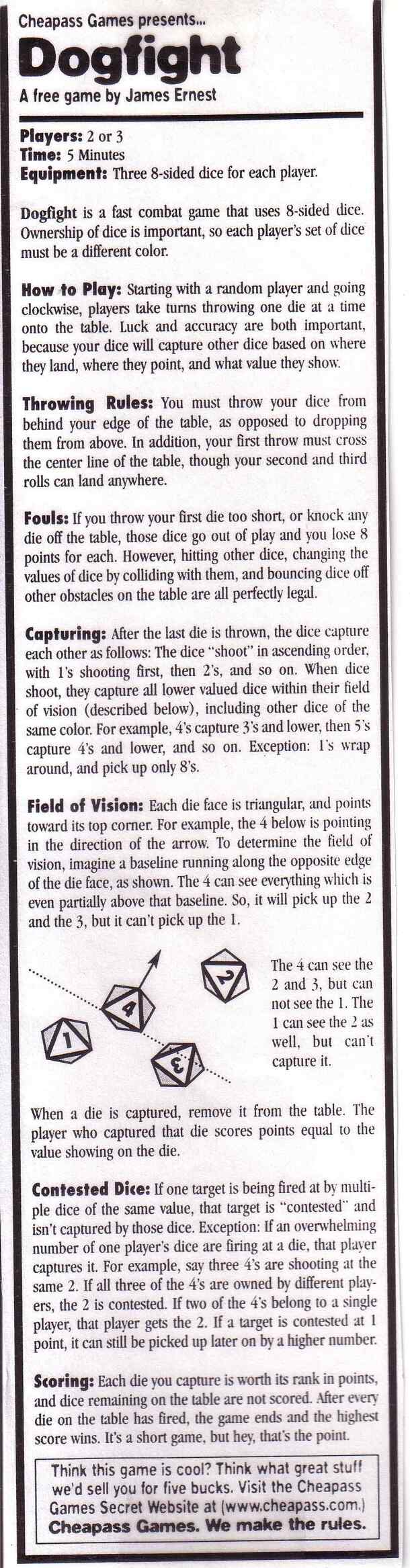 In Dogfight, each player has three eight sided dice which are rolled in turn. Dice "capture" other dice based on number and location when rolled on the table from behind a line. Dogfight was originally conceived as a collectible dice game called Zodiac in which twelve unique characters were composed of sets of three custome 8-sided dice. The idea of...