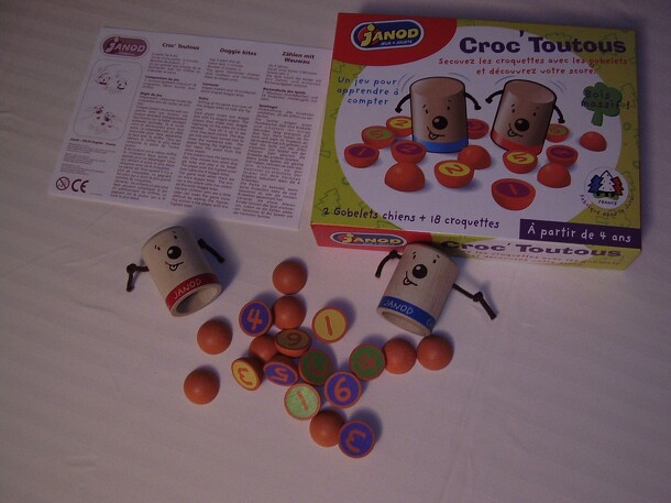A selection from the included English rules of the game "Croc' Toutous" by Janod Jeux of France - "Contents: Two cute wooden doggie shakers and 18 numbered dome-shaped doggie bites. Setup: Turn over all the Doggie Bites to hide the figures. Rules: Each player covers one doggie bite with his doggie shaker. The players then shake their doggie vigorously on...