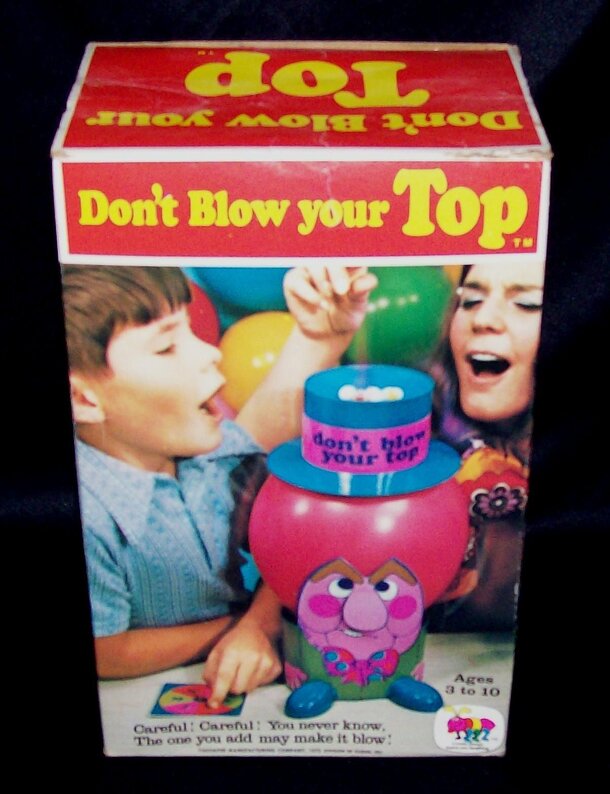 From the box: "Careful! Careful! You never know, The one you add may make it blow!" A spinner is used to determine how many marbles each player in turn must drop in a hat that sits on top of a balloon-man's head. Small strips with a texture resembling extremely rough sandpaper are attached under the hat; these sit gently on the surface of the balloon-head....
