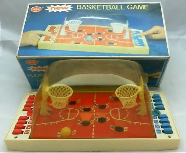 In this action game, the object is for 2 players or 2 teams to score goals and baskets with their dolphin water polo team. Each play at opposite ends of the board. In front of you there is are a few levers that control the team. The board has a number of indentations, into which the ball will settle. When it does, if you press the right lever, it will be...