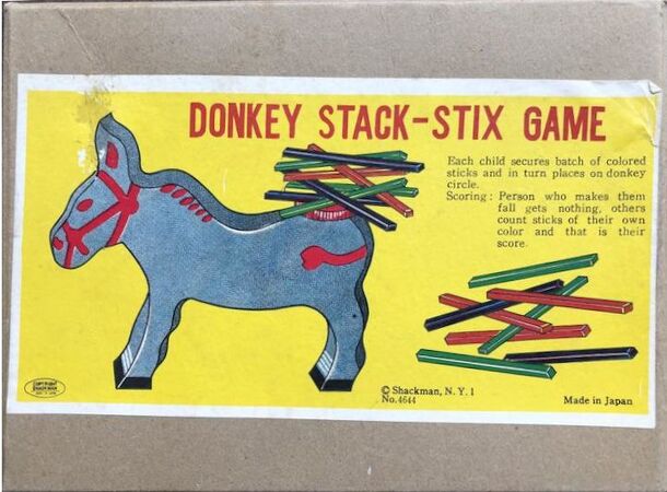 Wooden cutout of a donkey that looks to be about an inch thick. On the donkey's tail is a small circular platform upon which one is to place small sticks that look like small matchsticks. From the boxtop: Each child secures batch of colored sticks and in turn places on donkey circle. Scoring: Person who makes them fall gets nothing, others count sticks of...