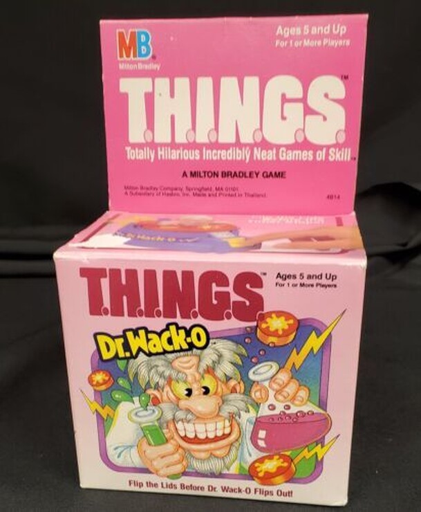 A wind-up dexterity game, part of Milton Bradley's "T.H.I.N.G.S." series of games. Try to flip over all of the discs and capture them with the magnetic hammer. From the box: Can you flip the lids before time runs out? Start the timer by moving the mouse counterclockwise as far as it will go. The platform will start turning. As lids pass in front of Dr....