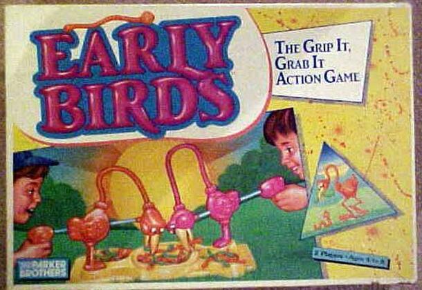 In this dexterity game, players grab worms using a hand-operated bird. The player who places the most worm in his worm nest wins. From the box: Grip that chirping bird's tail and wiggle its long, waving neck over the pile of worms. How many of them can you grab with your bird's beak while your opponent and his early bird battle you for the same squirmy...