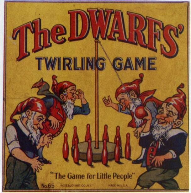 Sort of a bowling type game. Upright stick in the center of the game with a ball on a string attached. 10 Pins standing up on spots around the stick. By twirling the ball on the stick the effort is made to knock down as many pins as possible with two shots. Players alternate attemps at knocking down all of the pins. Highest score after 10 attempts wins the...