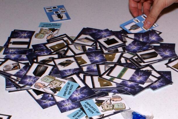 "Play as a sleazy computer salesman in this insanely, chaotic card/ dexterity game of sensory overload." In Employee of the Week, there are seven working days during which the players must collect the necessary parts to fulfill as many orders as possible. Employee of the Week is self-published by Toronto-based Steve Lefort (creator of Treasure Quest), and...
