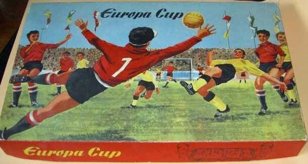 Action football game. The pitch and players are tinplate. The football players have their own indent, into which the ball will naturally settle. When it does, you can slide the player back, to get the football to come round to the fron of the player. Now you can use the player to kick the ball with the intention of either passing the ball to another player...