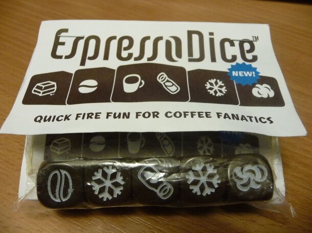 This game uses 5 dice, each bearing one each of the symbols for Coffee, Chocolate, Milk, Ice, Steam and Cup. Two different games can be played. Espresso-Rapido is a two-player game like 'Snap' played with dice. Players get to steal the other player's dice if they spot matching symbols. Espresso-Grande is a game for up to six players where players get up to...