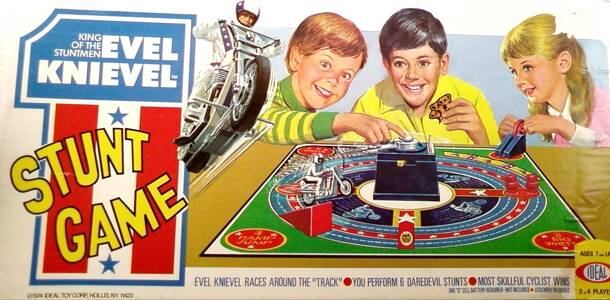 "Evel Knievel races around the Track. You perform 6 Daredevil stunts. Most skillful cyclist wins." A battery operated board game based on the exploits of the motorcycle riding, car jumping daredevil. The stunt motorcycle moves around a circular track and a "brake" button on the center motor allows the players to start and stop the motorcycle once a stunt...