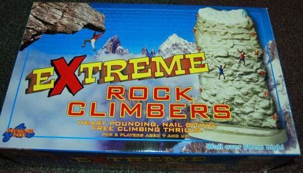 YOU control your climber up the terrain of this mountain. It's over 2' tall! Special magnetic grippers that you wear on your fingers make contact with your climber's hands. Try to get to smoother paths if you can as flags mark how far you have gone. Position your climber on a hook if you need to plan you next move. But don't wait too long! After three...