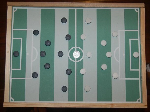 Traditional Brazilian soccer (football) game for 2 players. Players must use their fingers to "kick" a regular coin - the "ball" - over a wooden table representing a soccer field, where metal pins - soccer players - are placed at regular spaces. The opponents alternate kicking (normally one kick each), trying to get the ball past the pins and to the...