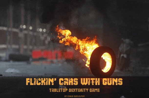 Flickin' Cars With Guns is a tabletop dexterity game for 2 or more players playable in as little as 10 minutes. Players use diecast toy cars (like Hot Wheels or Matchbox) to represent armed vehicles. The goal is to destroy your opponents by shooting and crashing into them. The game is meant to be played on a standard kitchen table, and you can use...
