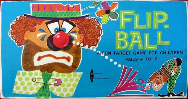 A children's dexterity game slightly reminiscent of skee-ball, only you use a small metal catapult to launch the ball instead of one's own hand. A cardboard insert remains in the box to collect low-scoring tosses (ones which don't go through the clown's holes). Another piece of cardboard folds over and stands upright, creating a vertical target. Points are...
