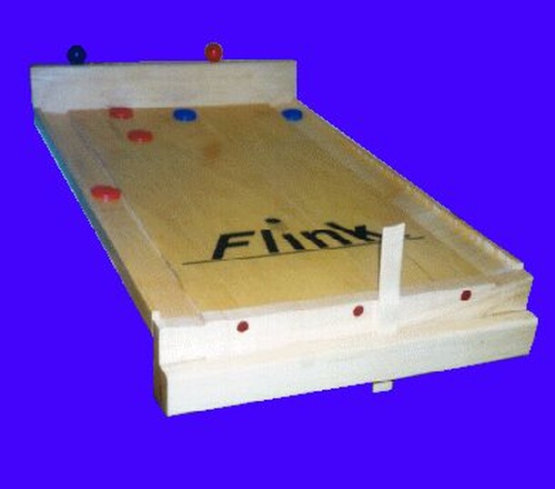 Flink's unique gameplay combines the fun of shuffleboard with the skill of pool! Using the "Flink sticks", players "flink" discs to be nearest the backboard. Knock your opponent off the board, into the "gutter" and out of play! The player whose disc is closest to the backboard after flinking five discs each wins that round. The player who wins five rounds...