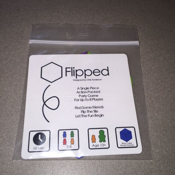 Flipped is a quick playing dexterity game. It contains a single hexagonal tile that is used to select which challenge a player must perform and is used to perform that challenge. Players flip the tile onto the table and must perform whichever of the six challenges is pointing at them. Some challenges are solo and others require help from another player....