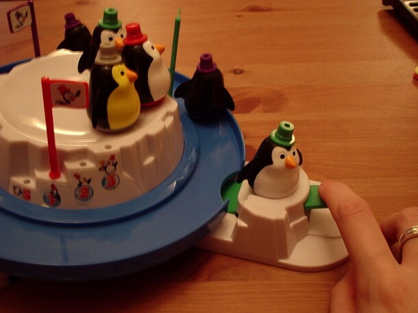 Childrens dexterity game that involves using a spring-loaded flipper to launch penguin figures onto a plastic iceberg. The iceberg has an electronic motor that causes it to tilt unpredictably, making it harder to time your shots. Penguins that miss, or are knocked off, the iceberg end up in "the sea" - a gutter around the base which deposits the penguins...